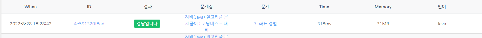 문제에서 x좌표를 우선으로 정렬하고 다음으로 y좌표에 따라서 정렬해주기때문에