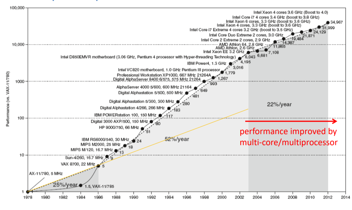 이 문제를 multi-core의 도입으로 해결하였다. 위 식에서 Frequency는 Clock Rate와 동일한 것인데 그것의 증가량은 Power의 증가로 이어진다고 했다. 이를 multi-core가 도입되면서 Voltage가 줄었다. 이로 Power도 줄게 된 것이다.
