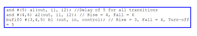Verilog에서 게이트 delay는 원시 인스턴스의 설계자에 의해 정의될 수 있다. 이를 통해 엔지니어는 실시간으로 논리 회로가 작동하도록 할 수 있다.