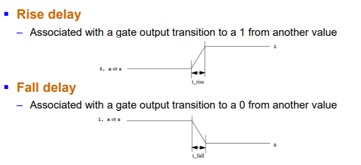 Rise delay는 게이트 출력 전환이 다른값 0,x 또는 z에서 1로 전환하는 데 걸리는 시간과 같다.