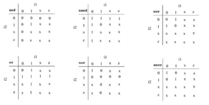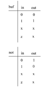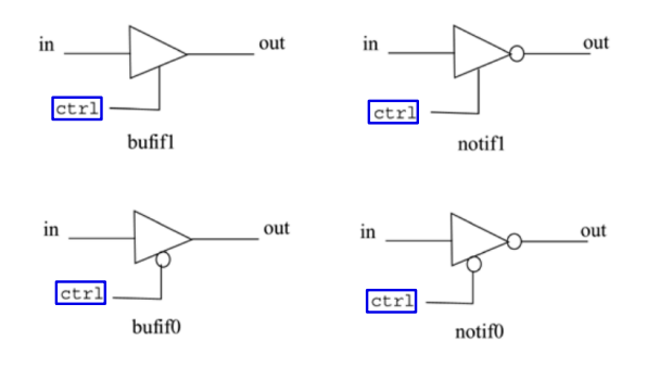 bufif와 notif는 각각 버퍼와 인버터이며, 출력을 활성화하기 위한 제어신호가 추가되었다. 위에서는 ctr1이 바로 그 신호이다. 게이트는 제어 신호가 활성화된 경우에만 유효한 출력을 가지는데, 그렇지 않으면 출력이 높은 저항을 가진 상태가 된다.