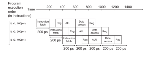 이렇게 되면 한명령어를 수행하는데는 1000ps가 걸린다. 하지만 pipeline을 이용하면 복수의 명령어들이 한 cycle에서 같이 수행되고 있기 떄문에, 3개의 명령어를 수행하는데는 1400ps밖에 걸리지 않는다.