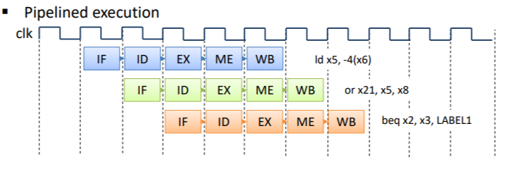 각 과정은 CPU 하드웨어의 각각 한부분씩 사용하고 있다. 위에서 ld명령어에서 ID를한다면, IF를 하는부분의 하드웨어가 놀고있게 된다. 이렇다면 시간적 손해일 것이다. 그렇기에 다음줄에 오는 명령어인 or의 IF를 해주게 된다.