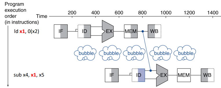 우리는 data hazard를 뛰어넘기 위해, Forwarding을 사용하는데, 이 경우에는 Forwarding을 사용하더라도 bubble이 한번 들어갈 수 밖에 없다 이 경우엔 1cycle 손해를 본다.