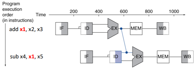 위에서 add x1,x2,x3의 EX에서 ALU의 Output은 sub instruction이 원하는 값이다. 그것을 EX의 input으로 떙겨온다.