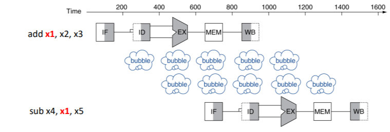 여기서 pipeline을 사용하여 차례차례 진행한다면 아직 add의 결과값이 들어가지도 않은 x1을 sub는 rs1으로 사용하게 될거다. 그러면 원하는 값을 사용하지 못한다.
