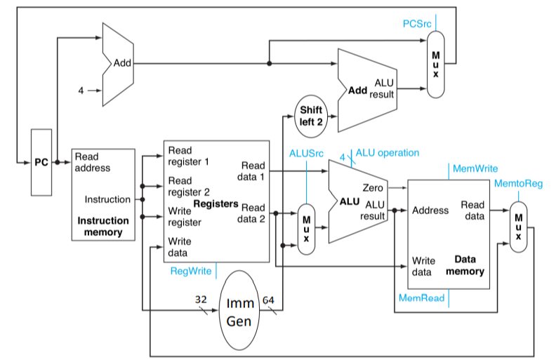 ALU control이 하나 더있다. control에서 그냥 바로 써도 되지 않나? 라는 생각이 드는데, ALU control을 빼내면, 메인 컨트롤이 작아지고, 복잡도가 하나로 합쳤을 때에 비해 아주 낮아지기 때문이다.