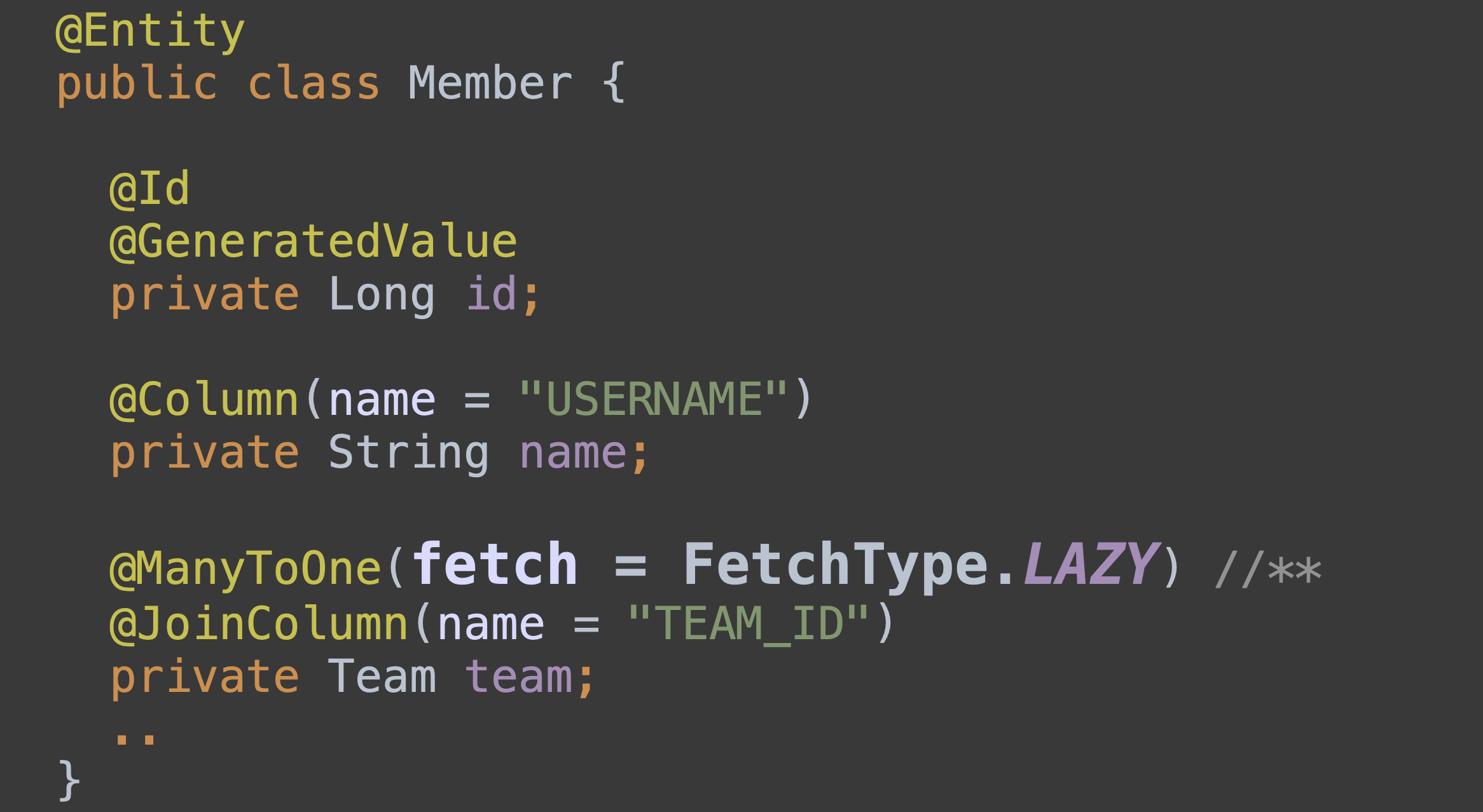 여기서 Team 클래스와 다대일 연관관계를 가지고 있다. 그리고 @ManyToOne 어노테이션 옆에 FetchType.LAZY를 설정해주며 지연로딩을 해주고 있다.