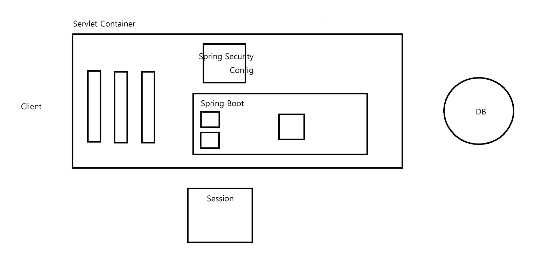 Client가 특정 요청을 날리면 요청이 서블릿 컨테이너(Servlet Container)라는 Tomcat Container를 지나서 스프링부트 어플리케이션에 도달하게 된다. 그 때, 서블릿 컨테이너는 여러가지 필터를 가지고 있다. 이때, 스프링 시큐리티를 의존성으로 채택하게 된다면, 해당 요청을 스프링 시큐리티가 필터에서 가로채게 된다.